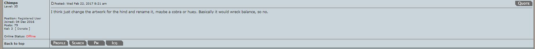 And to finalise here is a quote from smitty from the linked threads on why doing this change is a big massive ball ache (you can replace cobra with all these new helicopter models being thrown about) and as Barf said: dont fix what isnt broken. There's a lot of broken things that need attention more than this and I linked a few of these issues in the wishlist thread